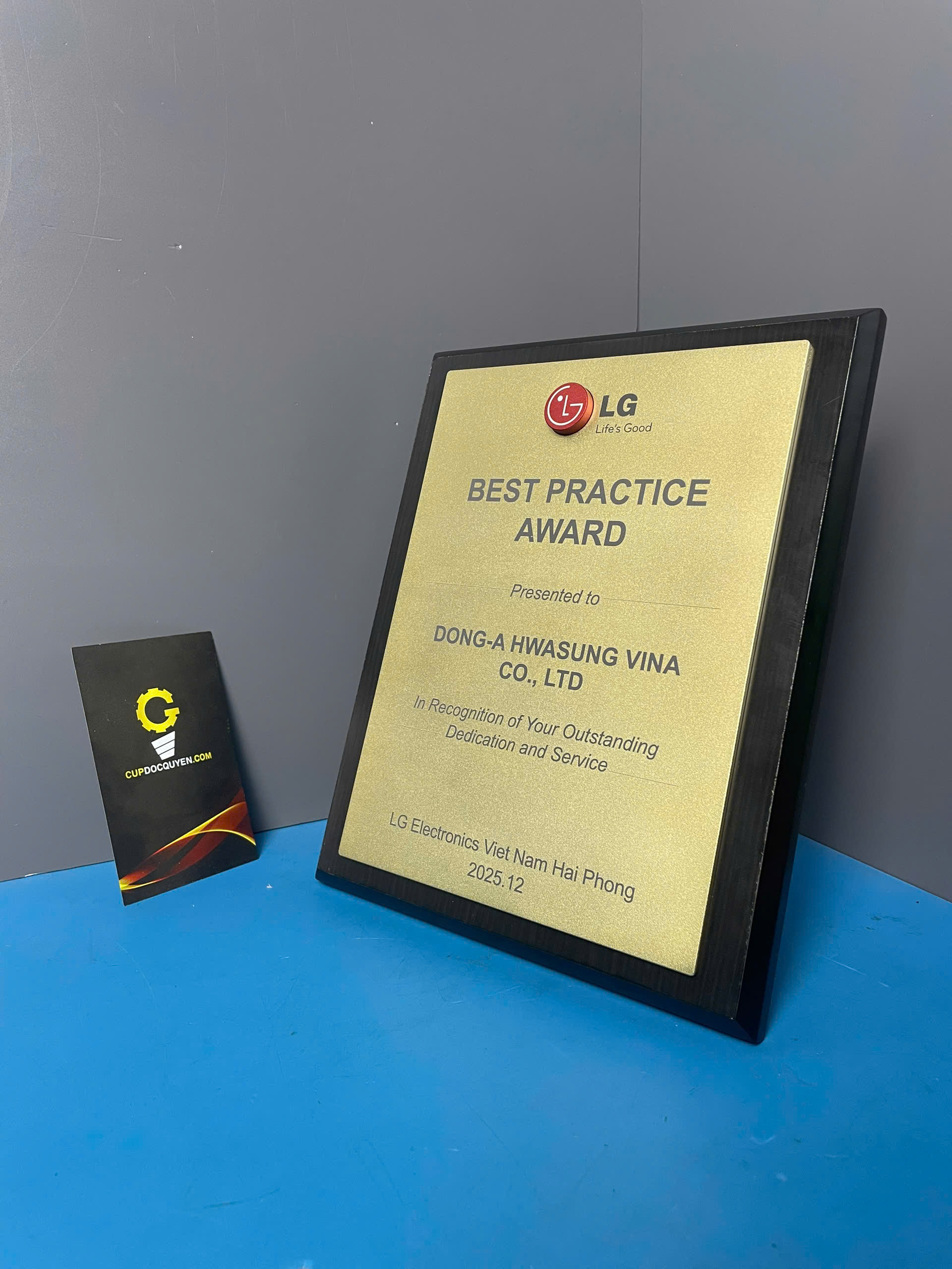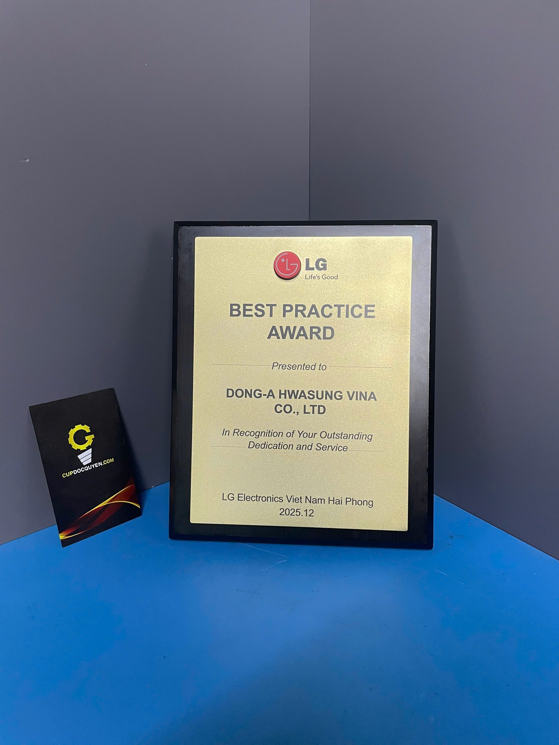 Trên nền gỗ đen nhám thanh lịch, phần mặt kim loại vàng ánh mờ được khắc nội dung rõ nét bằng công nghệ laser hiện đại, nổi bật với logo LG - Life’s Good và dòng chữ “Best Practice Award”, tạo nên tổng thể vừa tinh tế, vừa trang trọng.
