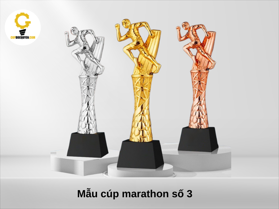 Bộ cúp này là một thiết kế kinh điển và rất phổ biến trong các giải đấu thể thao, đặc biệt là marathon, với sự kết hợp hài hòa giữa hình ảnh động của vận động viên và phần đế vững chắc, thể hiện sự vinh quang và thành tích. Bộ cúp được trình bày theo thứ hạng: Vàng (vô địch), Bạc (Á quân), và Đồng (Hạng ba).