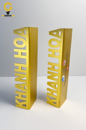 - Thiết kế hình khối độc đáo: Cúp có kiểu dáng hình trụ đứng bo góc tinh tế, với chữ “KHÁNH HÒA” được cắt rỗng CNC dọc theo cạnh - một điểm nhấn sáng tạo vừa hiện đại vừa thể hiện mạnh mẽ tinh thần địa phương.