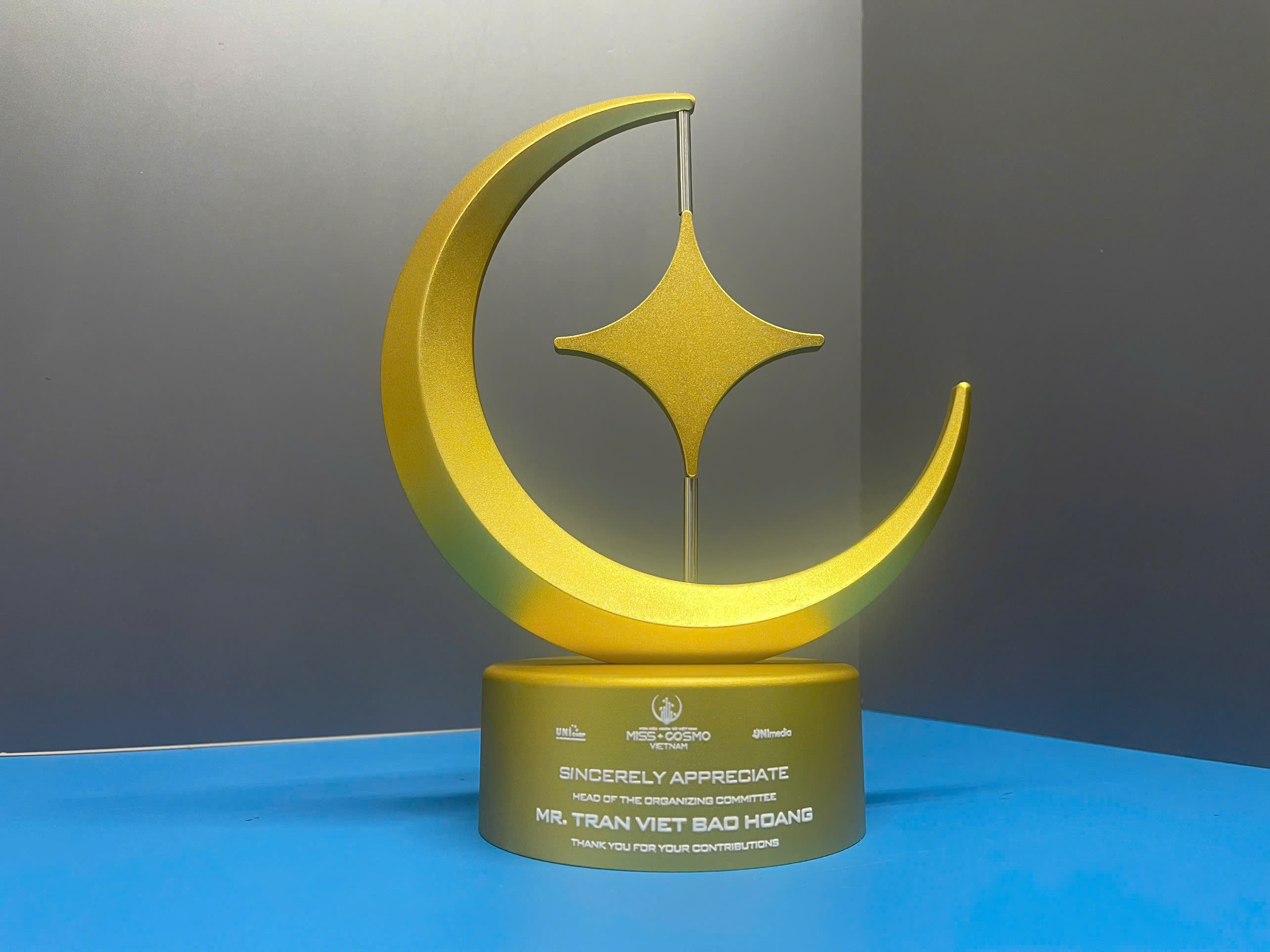 Khi ánh đèn sân khấu bừng sáng, chiếc cúp trao giải hoa hậu Miss Cosmo Vietnam 2025 đã thực sự trở thành tâm điểm, thu hút mọi ánh nhìn. Với thiết kế độc đáo, bộ đôi cúp bao gồm cúp kim loại hình ánh trăng mang đến vẻ đẹp vừa hiện đại, vừa giàu tính biểu tượng.