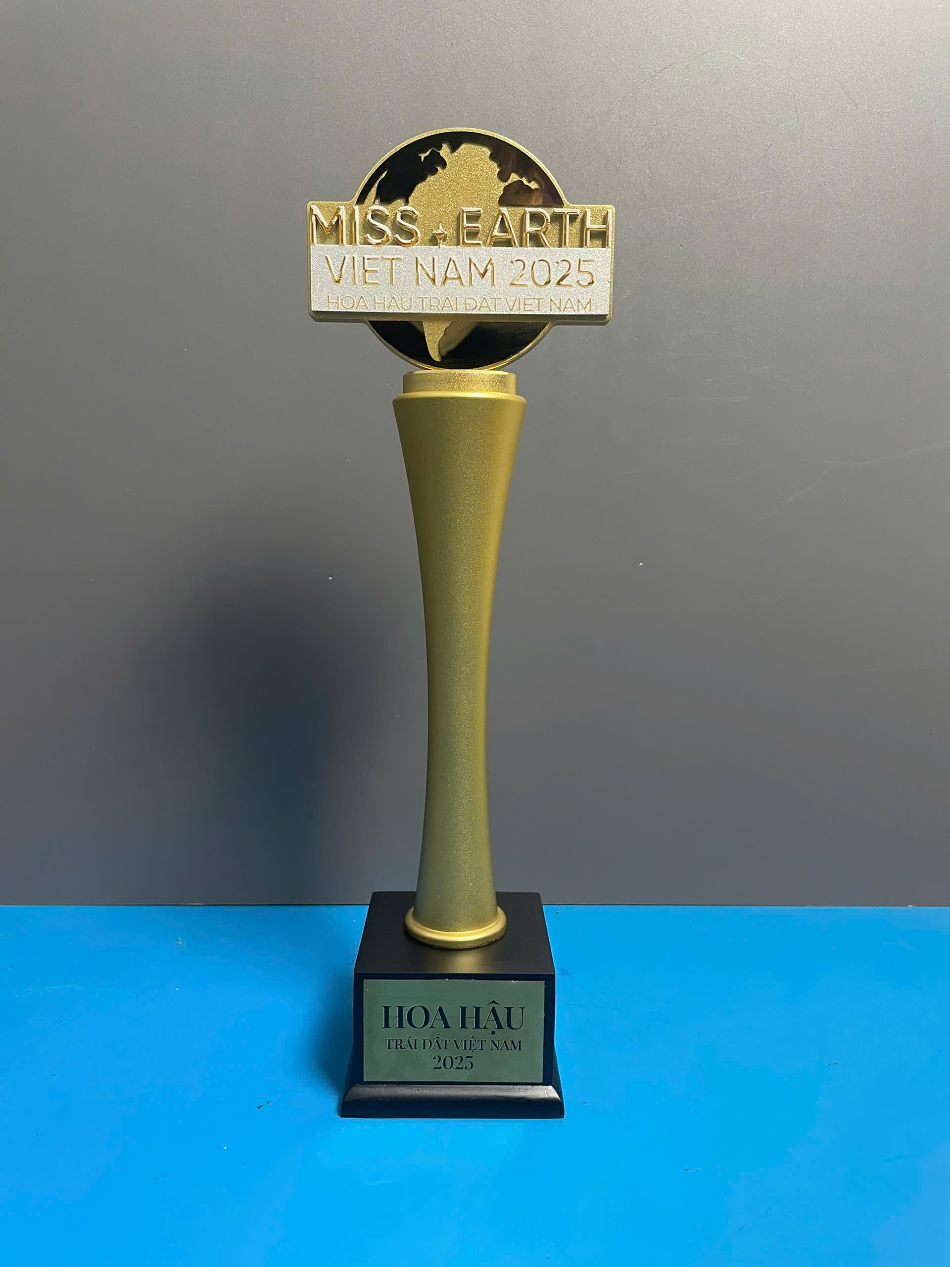 Chiếc cúp trao giải hoa hậu Miss Earth Vietnam 2025 được thiết kế với cảm hứng từ Trái Đất và dòng chảy tái sinh của thiên nhiên, mang đến một tác phẩm vinh danh vừa sang trọng vừa đầy ý nghĩa.