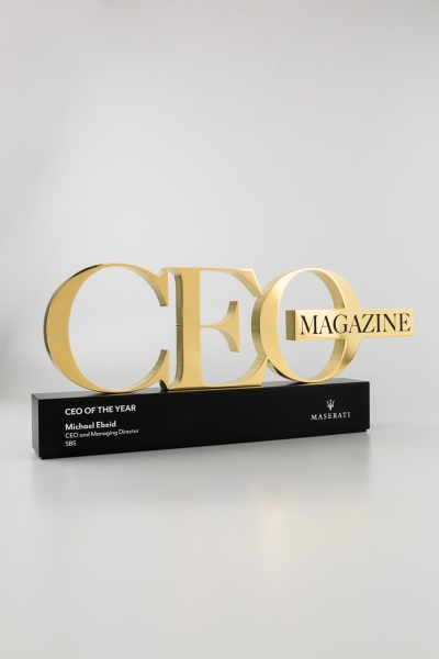 - Cúp vinh danh tạo hình theo chữ CEO vàng, đặt trên đế hợp kim đen.