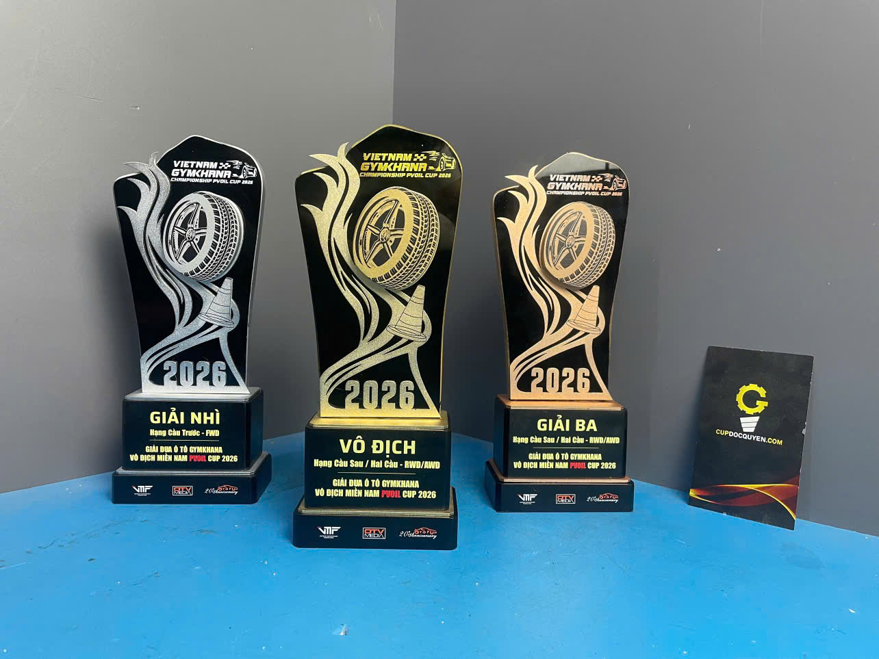 - Thiết kế: Cúp đua xe này là sự giao thoa táo bạo giữa nền đen tuyền bí ẩn và các họa tiết 3D kim loại đúc nổi. Tâm điểm của chiếc cúp là hình ảnh lốp xe thể thao xé gió vượt qua cọc tiêu được khắc họa vô cùng chân thực cùng những đường lượn sóng sắc lẹm tượng trưng cho vệt bánh xe cháy khét.