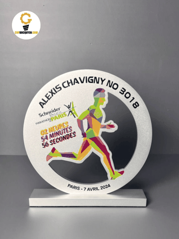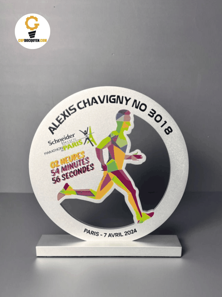 - Mẫu cúp giải chạy này chọn hình khối tròn đại diện cho sự luân hồi, cho những vòng quay không mệt mỏi của bước chân và sự trọn vẹn của một hành trình chinh phục.