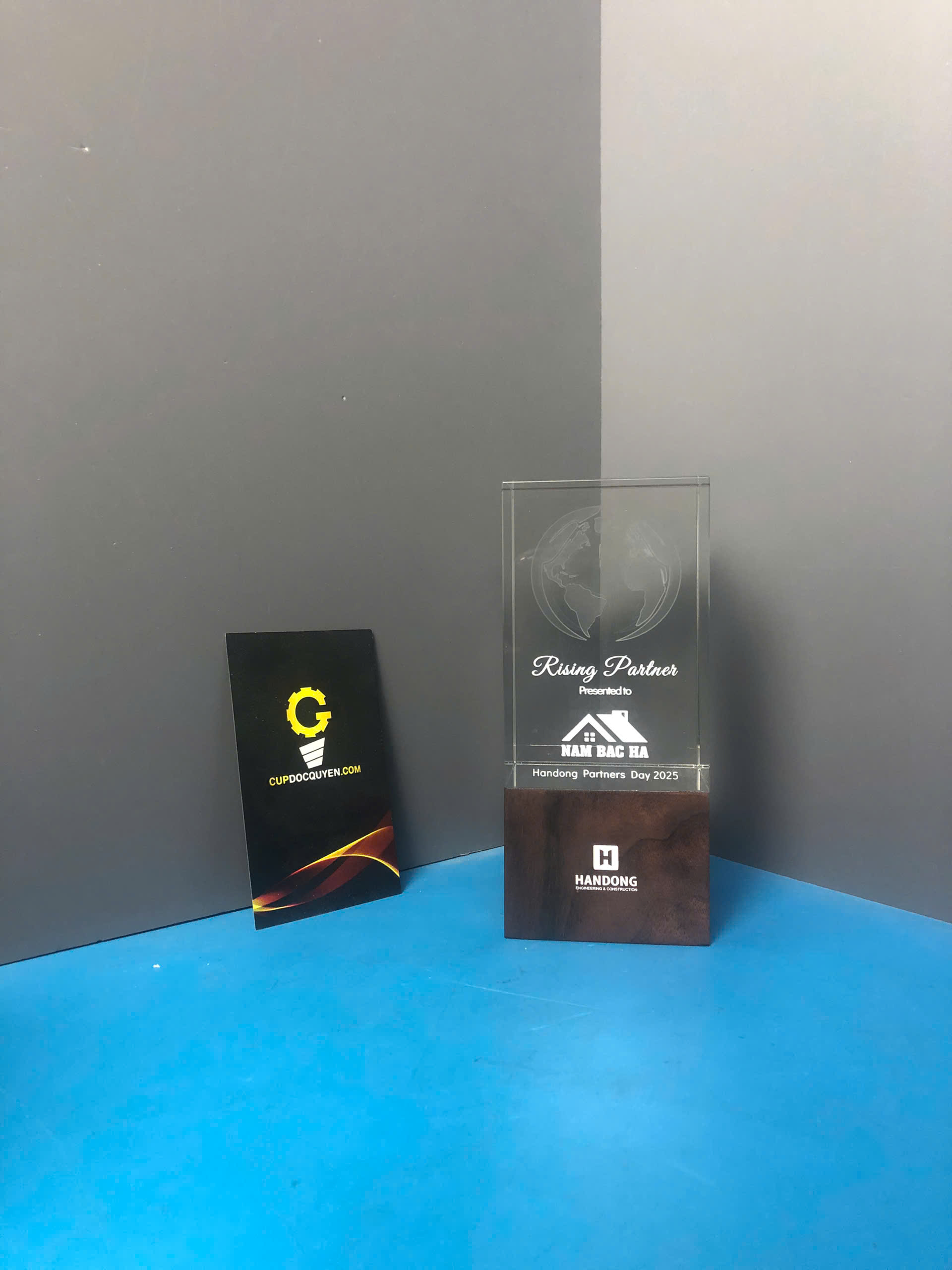 - Chiếc cúp ghi điểm nhờ cách phối màu rất hài hòa. Phần đế mang sắc nâu trầm của gỗ tự nhiên, nhìn vào là thấy sự ấm áp, mộc mạc và tin cậy. Ngược lại, khối pha lê phía trên lại trong veo, sáng lấp lánh. Hai tông màu này, một trầm ấm, một tinh khiết khi đứng cạnh nhau lại tôn nhau lên rực rỡ