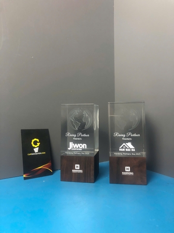 Mẫu cúp gỗ pha lê này không đi theo lối mòn của những thiết kế đơn điệu. Nó là sự kết hợp tinh xảo của khối pha lê K9 và nét trầm mặc, ấm áp của gỗ tự nhiên. Hai chất liệu này hòa quyện, tạo nên một tổng thể vừa sang trọng lại vừa gần gũi, rất "được lòng" các doanh nghiệp.