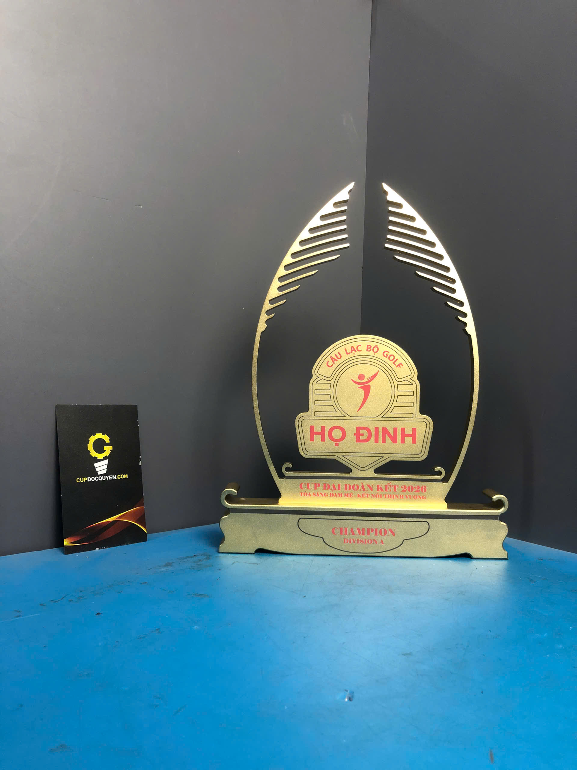 Điểm thu hút ánh nhìn đầu tiên chính là bố cục cắt CNC phẳng vô cùng độc đáo. Hai nhánh cúp vươn lên mạnh mẽ ôm trọn lấy logo trung tâm tựa như đôi cánh chim đại bàng hoặc những nhành nguyệt quế cách điệu mang ý nghĩa bảo bọc và tôn vinh sự thăng hoa. Từng đường vát cắt rãnh trên phần viền đều được tính toán tỉ mỉ tạo ra sự thanh thoát nhưng không kém phần uy lực.