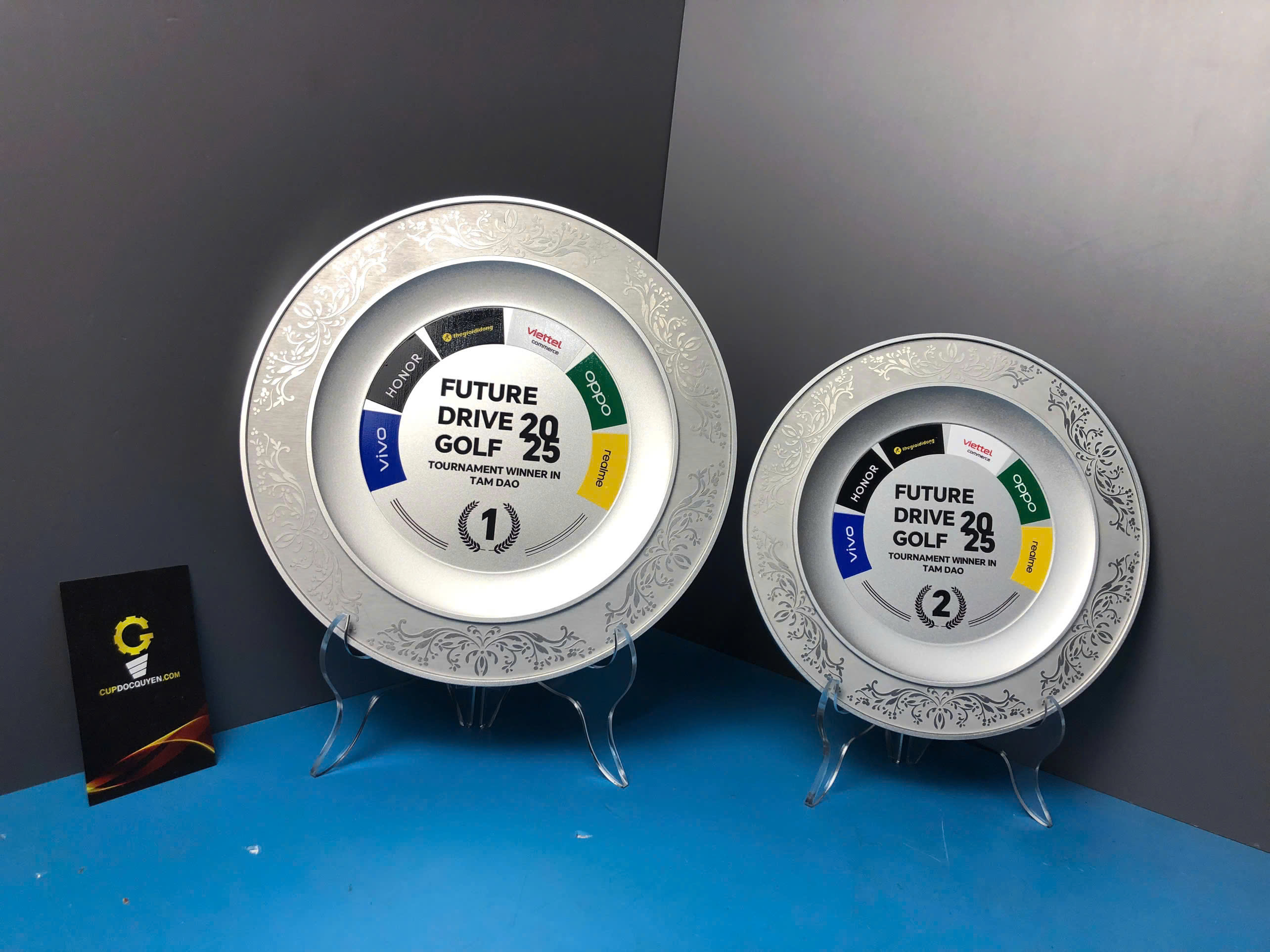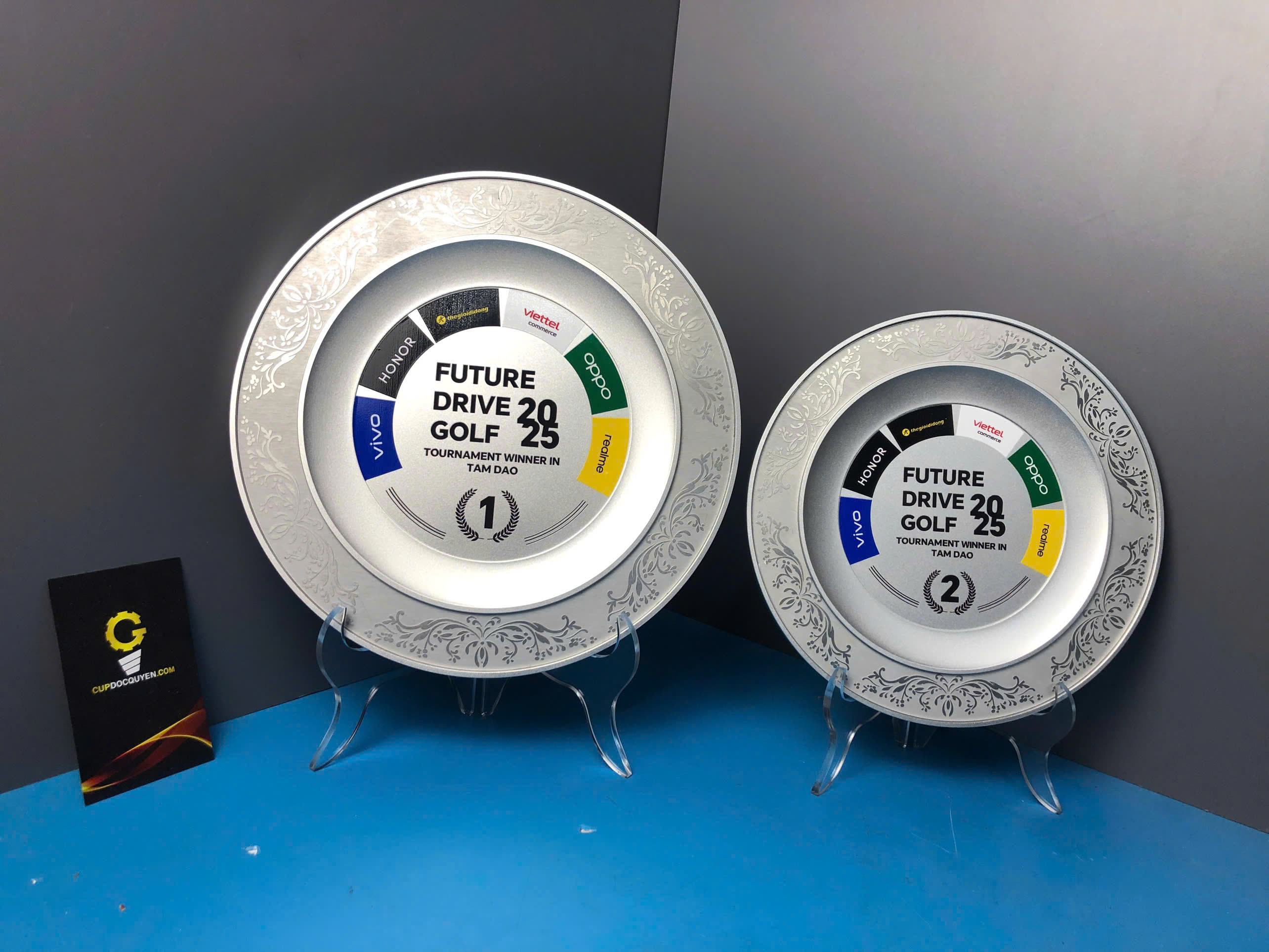 Tâm đĩa nổi bật với thiết kế logo sự kiện Future Drive Golf 2025, cùng các thương hiệu đồng hành như Vivo, Honor, Oppo, Viettel, Tecno, tạo nên tổng thể hiện đại và chuyên nghiệp khẳng định quy mô và uy tín của giải đấu.