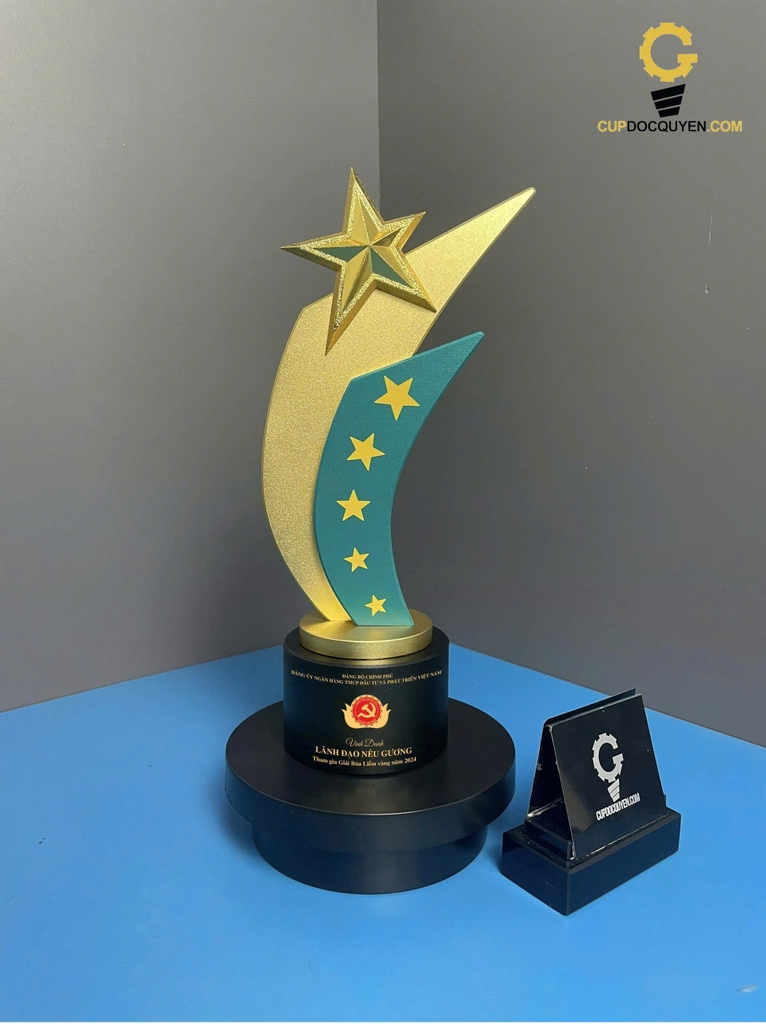 Phần ngôi sao 3D nổi ở đỉnh cúp được gia công tỉ mỉ với các mặt cắt phản sáng tinh tế, tạo hiệu ứng rực rỡ dưới ánh đèn sân khấu. Dải lưỡi lửa vàng uốn cong tượng trưng cho sự phát triển bền vững và đà tăng trưởng mạnh mẽ của ngân hàng. Phía dưới là dải xanh ngọc đính 5 ngôi sao nhỏ, thể hiện khát vọng chinh phục và hướng đến những giá trị chuẩn mực cao nhất.