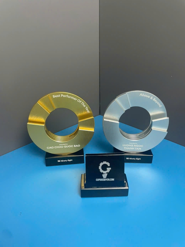 Bộ cúp sáng tạo dạng vòng tròn trong hình là một lời giải khác biệt: tối giản, hiện đại nhưng cực kỳ ấn tượng khi đặt trên bàn lễ tân, sân khấu vinh danh hay góc làm việc của người nhận. Đây là mẫu cúp vinh danh dành cho những doanh nghiệp đề cao tinh thần đổi mới và hiệu suất vượt trội.
