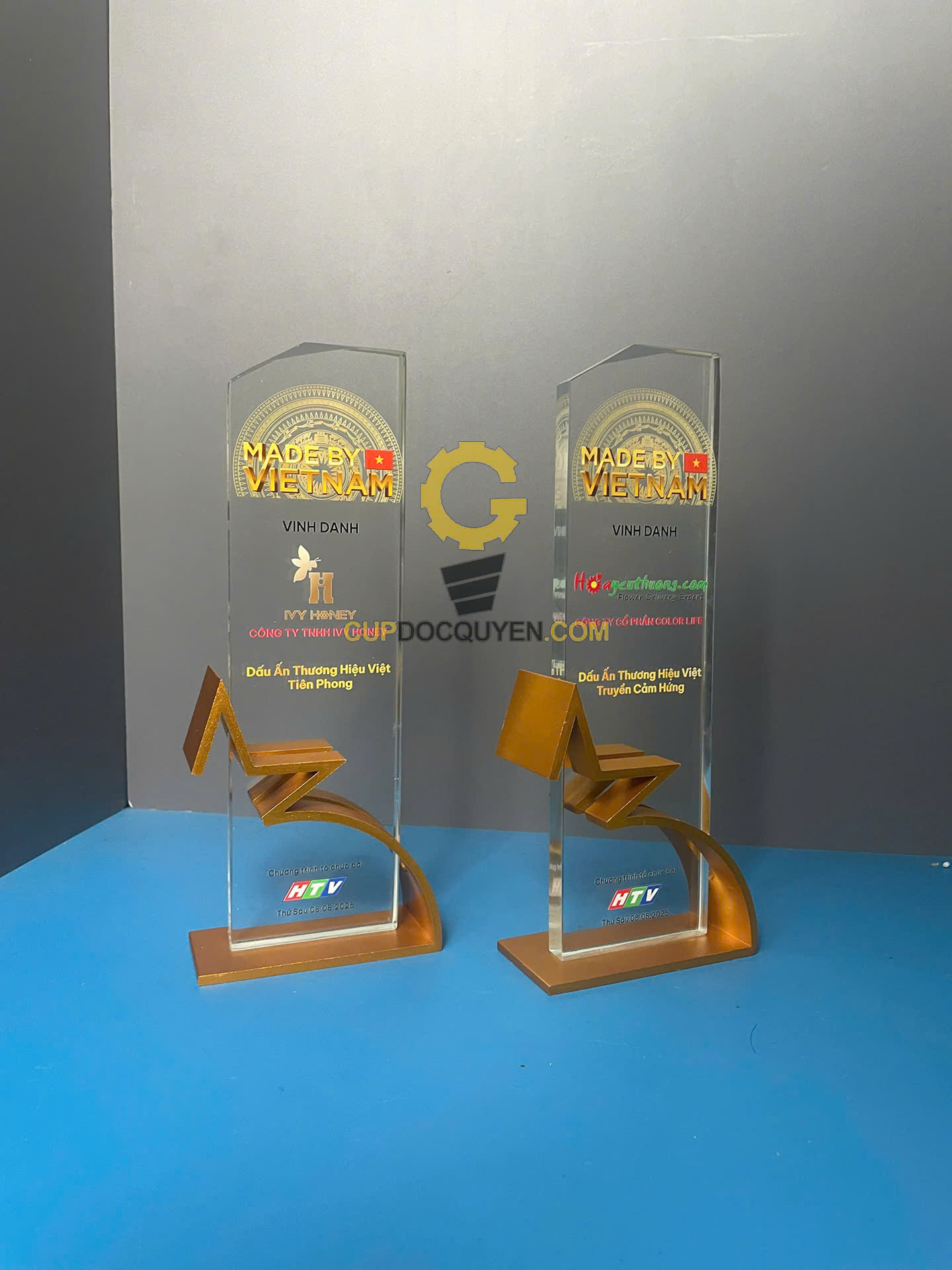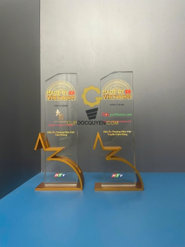 Đây là một mẫu cúp pha lê nổi bật, khác biệt nhờ sự kết hợp hài hòa giữa tính hiện đại, sang trọng và bản sắc Việt, rất phù hợp để trở thành biểu tượng vinh danh trong những sự kiện lớn.