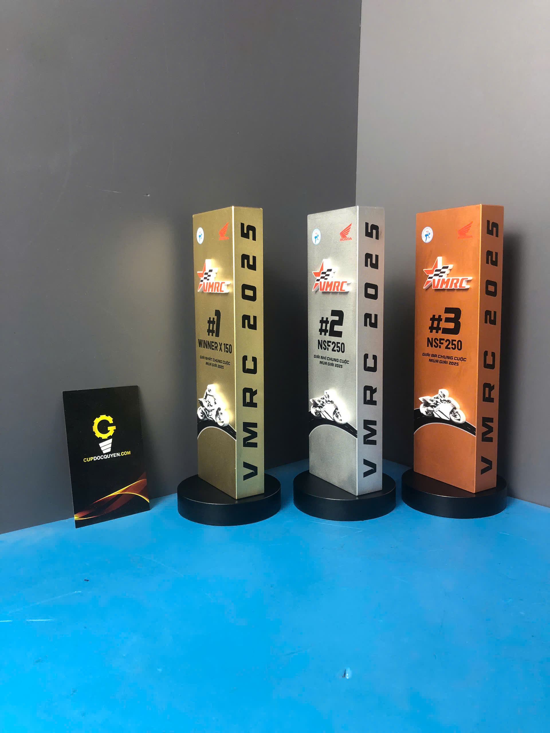 Cúp thể thao đua xe VMRC 2025 được phối sắc tinh tế, mang đậm tinh thần tốc độ và chiến thắng 3 màu: vàng kim, bạc ánh nhũ, đồng ánh đỏ. Ba gam màu kim loại rực rỡ hòa quyện, tạo nên vẻ đẹp mạnh mẽ, sang trọng và giàu cảm xúc.