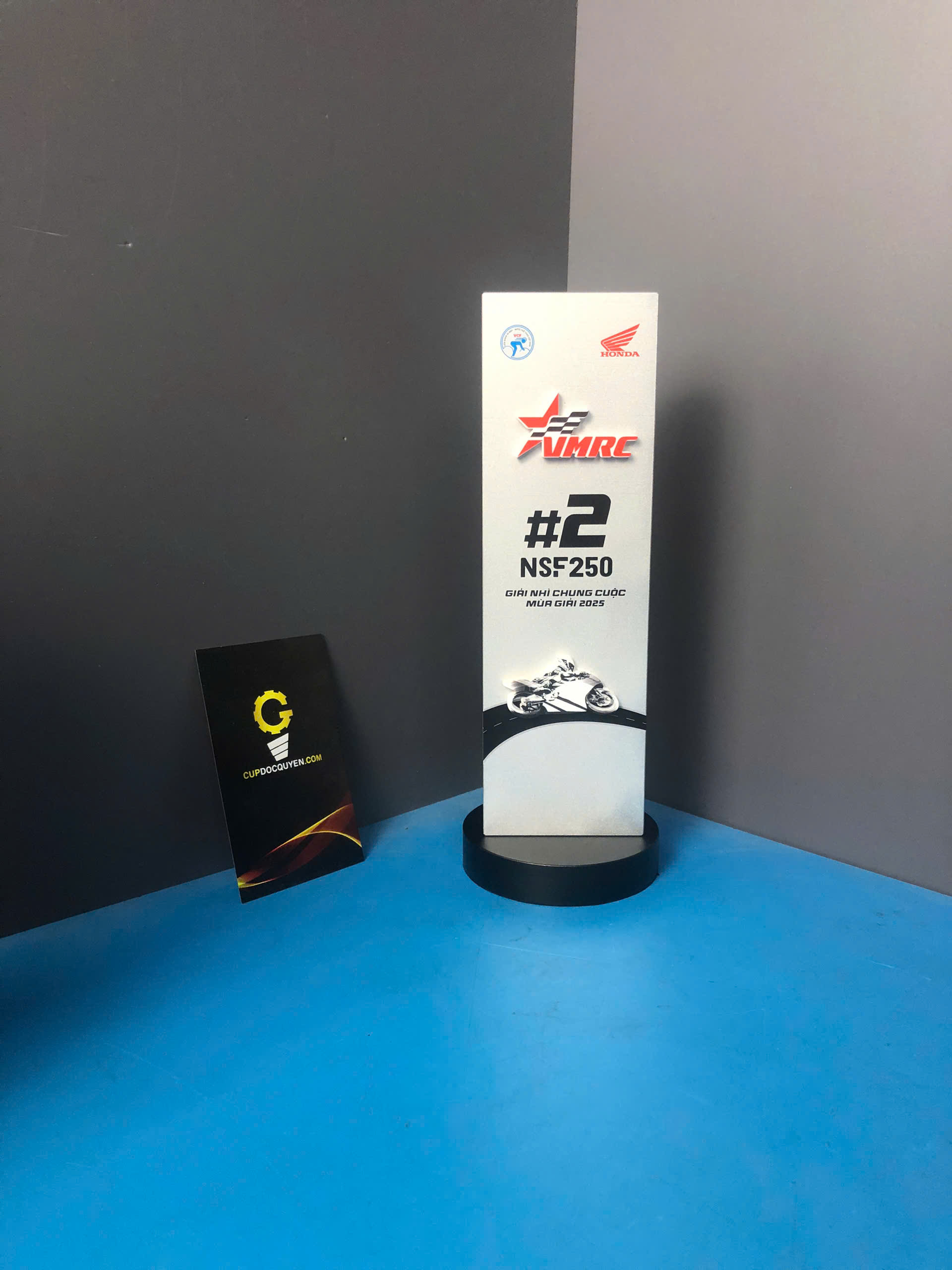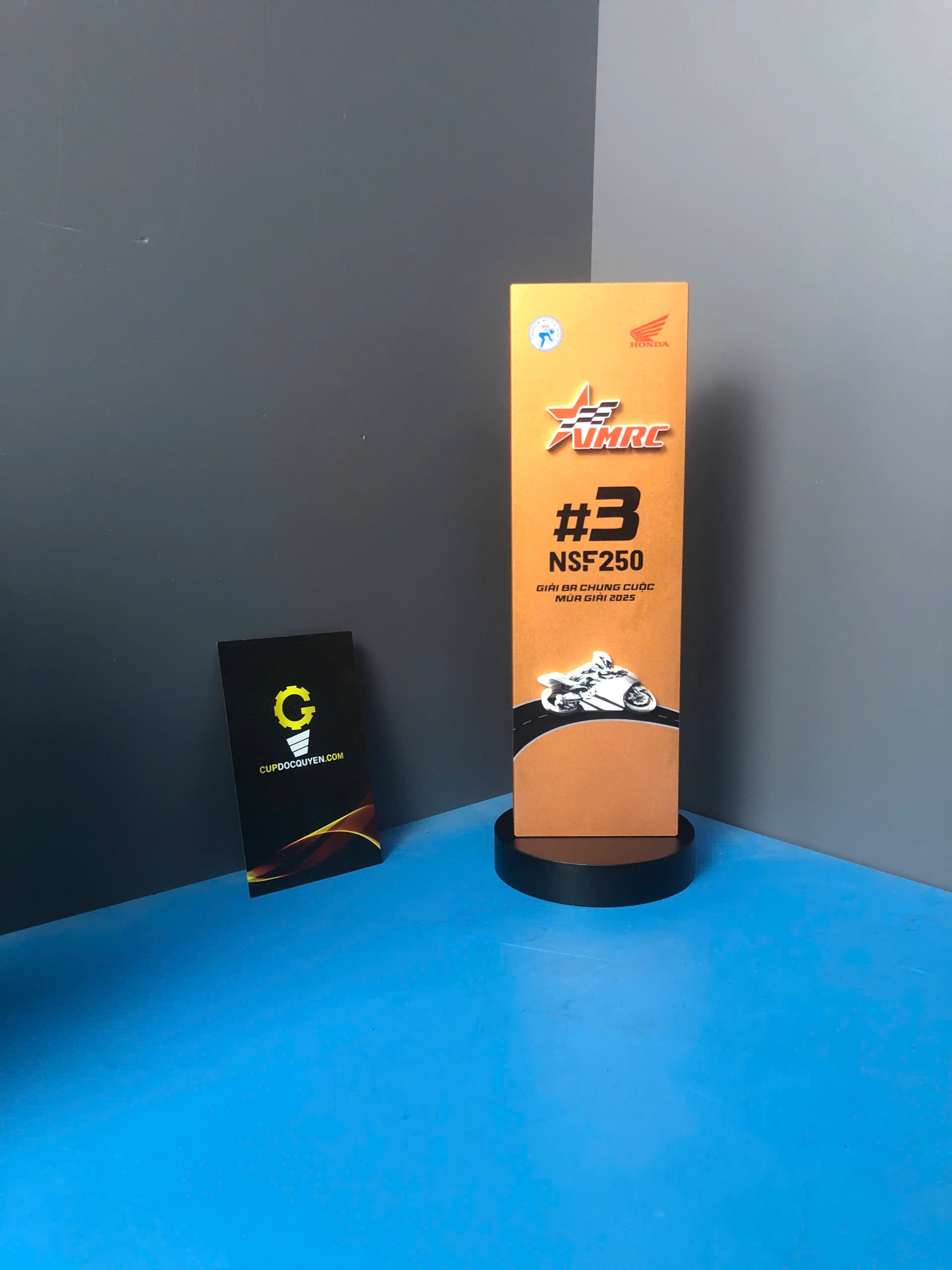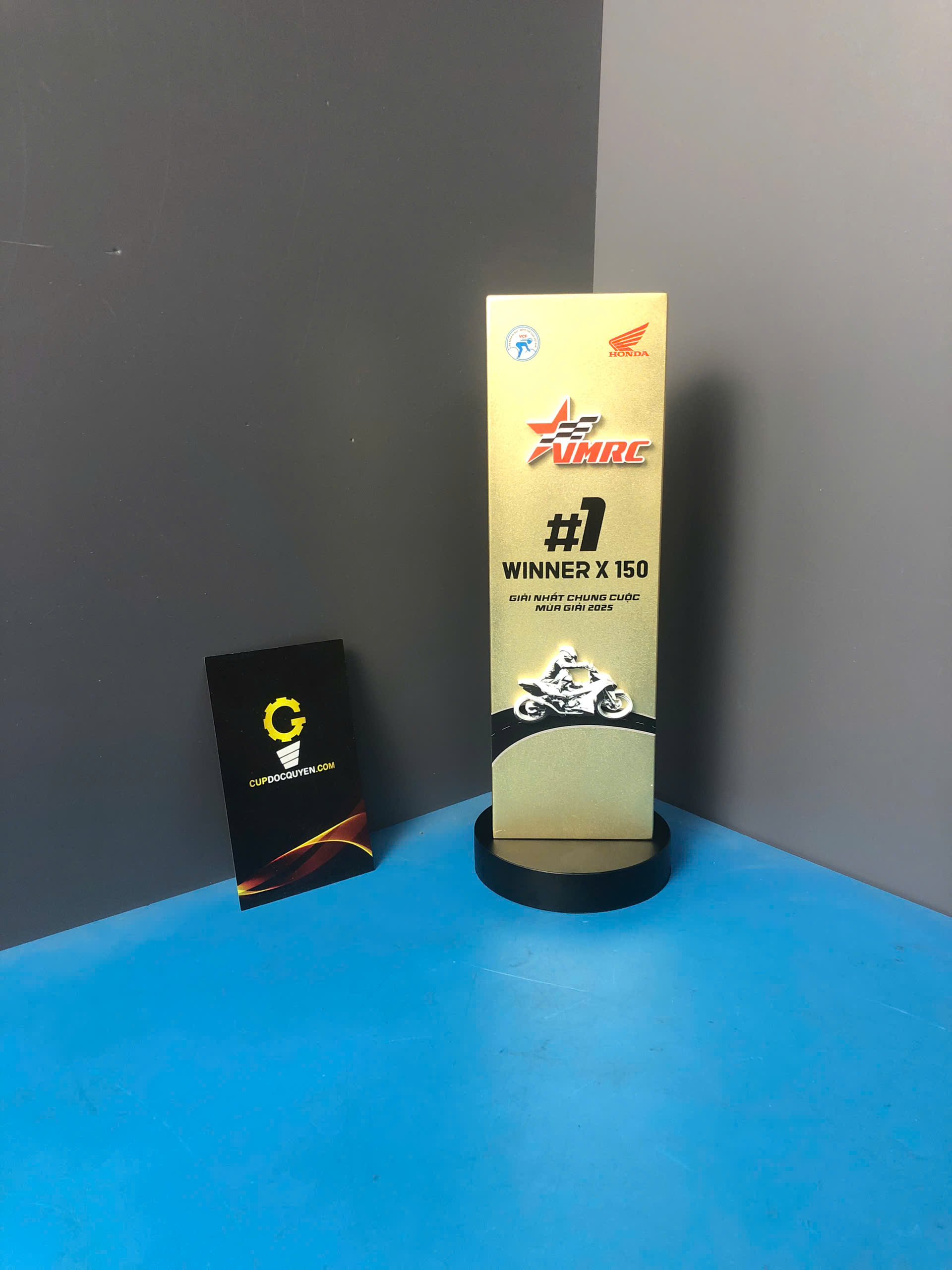 Chiếc cúp thể thao đua xe VMRC 2025 là sự kết hợp hoàn hảo giữa sức mạnh thể thao và tinh thần chiến thắng, mang đến hình ảnh đầy năng lượng cho các giải đua mô tô chuyên nghiệp.