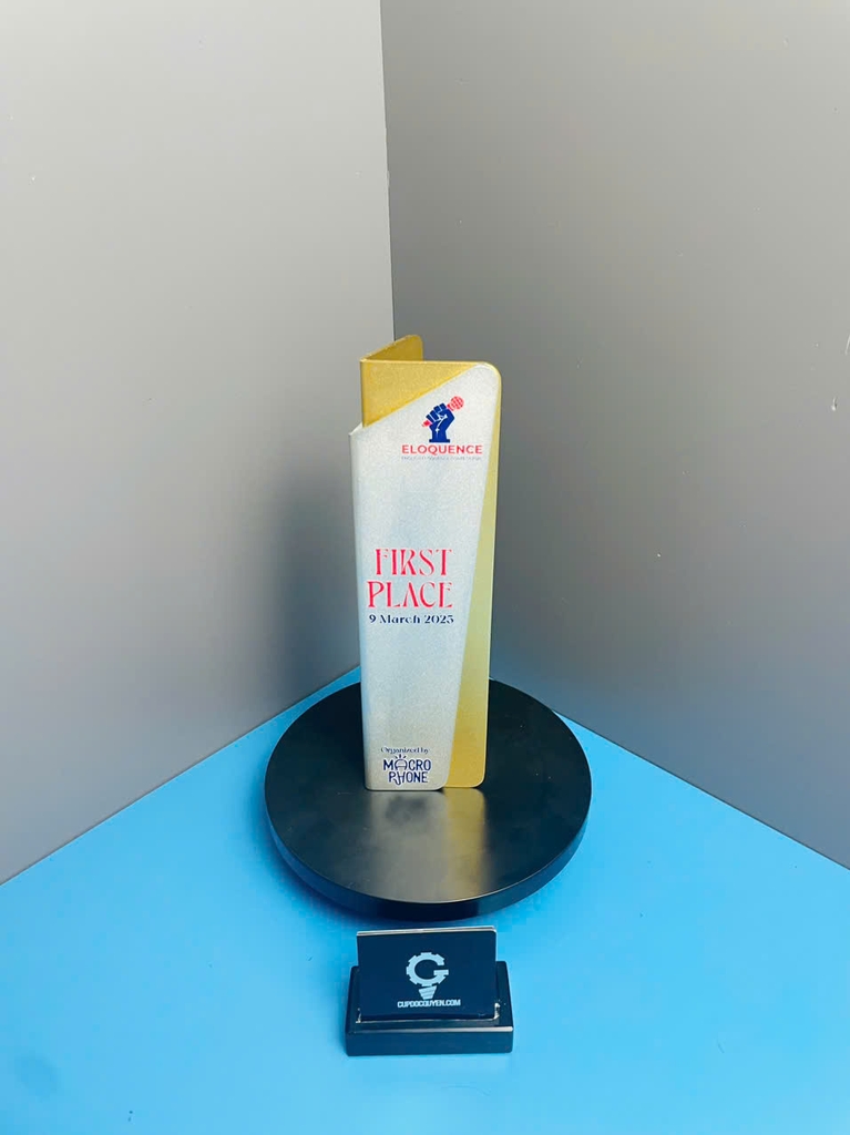 Chiếc cúp là biểu tượng cho sự ghi nhận thành tích xuất sắc của người nhận trong lĩnh vực "ELOQUENCE" (tài hùng biện). Giải thưởng "FIRST PLACE" khẳng định vị trí dẫn đầu của người chiến thắng.