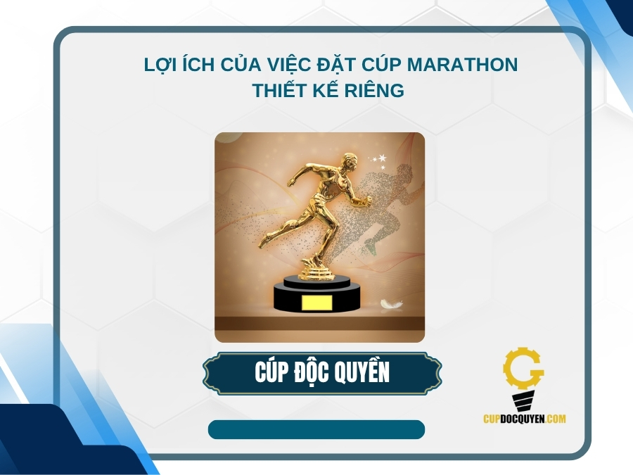 Một chiếc cúp marathon thiết kế riêng sẽ giúp cúp vinh danh mang màu sắc của thương hiệu, giúp các ban tổ chức tăng độ nhận diện của mình. Vì sau vạch đích là vinh quang, và sau chiếc cúp là một thương hiệu biết kể chuyện.